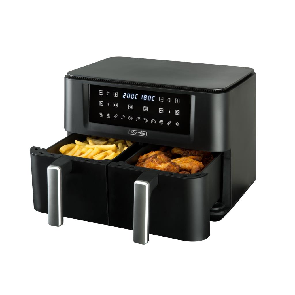 - Enjoy healthier meals with the BOURGINI DUAL BASKET AIRFRYER 9LTR