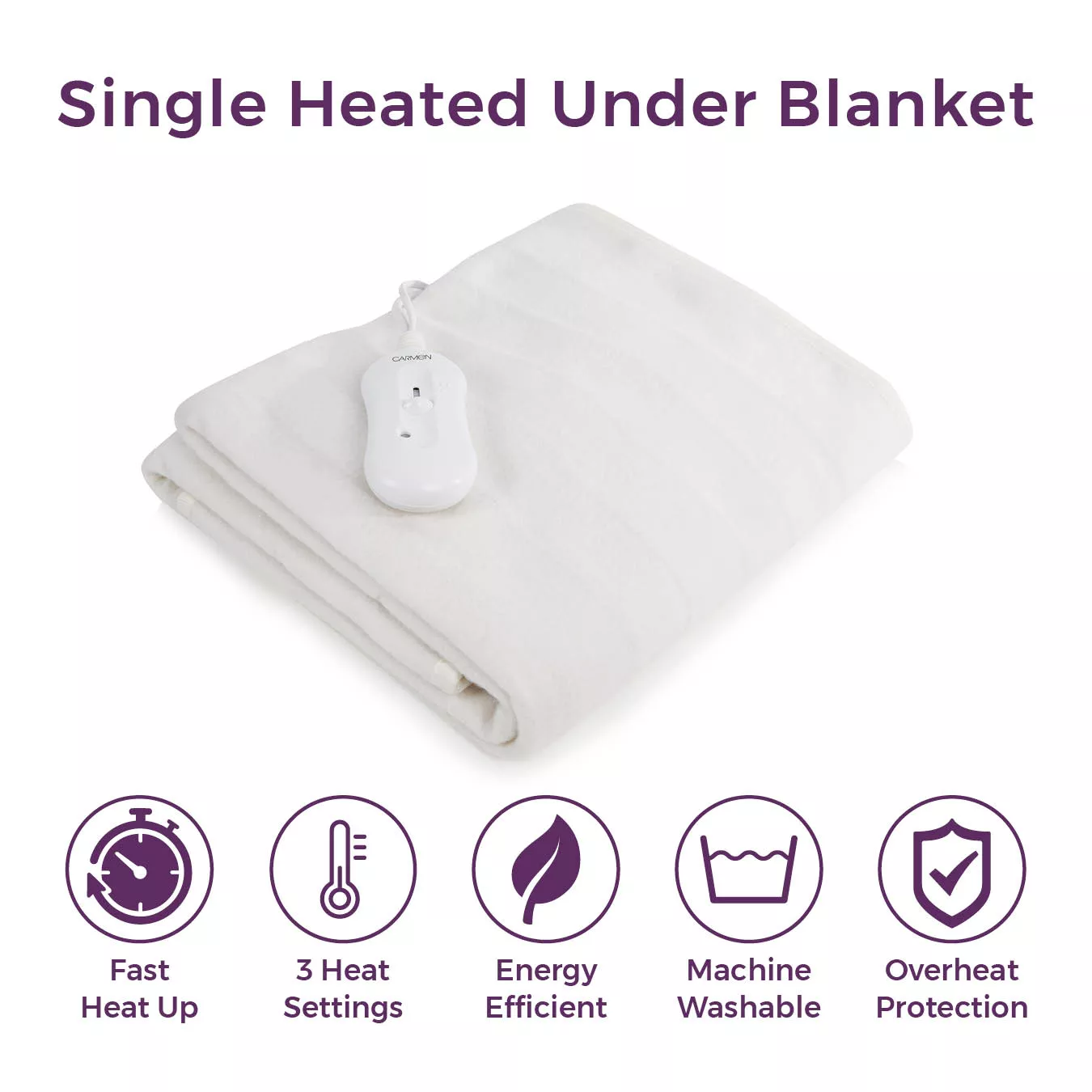 Stay warm and comfortable all night long with the Carmen Single Size Heated Under Blanket. The adjustable heat settings allow you to control the warmth, while the soft and luxurious material provides a cozy feel. This machine washable blanket is easy to maintain and is perfect for individual use. Get ready to enjoy a warm and restful sleep with the Carmen Heated Under Blanket.