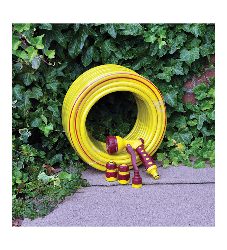 - Includes 30m quality reinforced hose, 7 dial deluxe spray gun, water stop, female hose fitting and threaded tap connector.