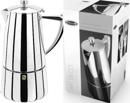 • Suitable for Gas, Halogen, Ceramic, Solid Plate and Induction • Double-walled, dribble-free pouring spout, large handle, replaceable silicone gasket, hinged lid with knob • Composition and Care: Stainless Steel. Dishwasher safe or hand wash • Dimensions: H 21.0 x W 7.5 x L 11.5cm. Capacity: 250m • Lifetime Guarantee • 5010763069775Stellar Art Deco 10 Cup Espresso Maker Capacity: 10 cup