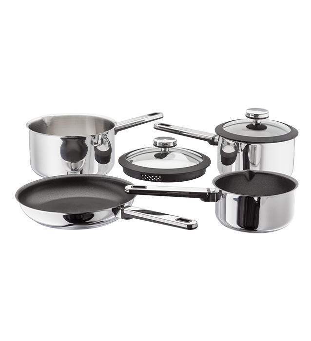 - INNOVATIVE MODERN DRAINING SAUCEPAN SET IN GIFT BOX – stunning high-sided saucepans in professional quality 18/10 stainless steel with unique handles on the lids and pans which are engineered with silicone to stay cooler than all metal-handles